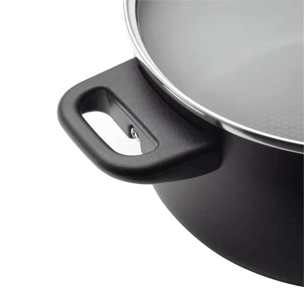 5.STURDY HANDLES, SHATTER-RESISTANT GLASS LIDS: Double-riveted handles on the pots and pans offer a confident grip and shatter-resistant glass lids seal in heat and moisture