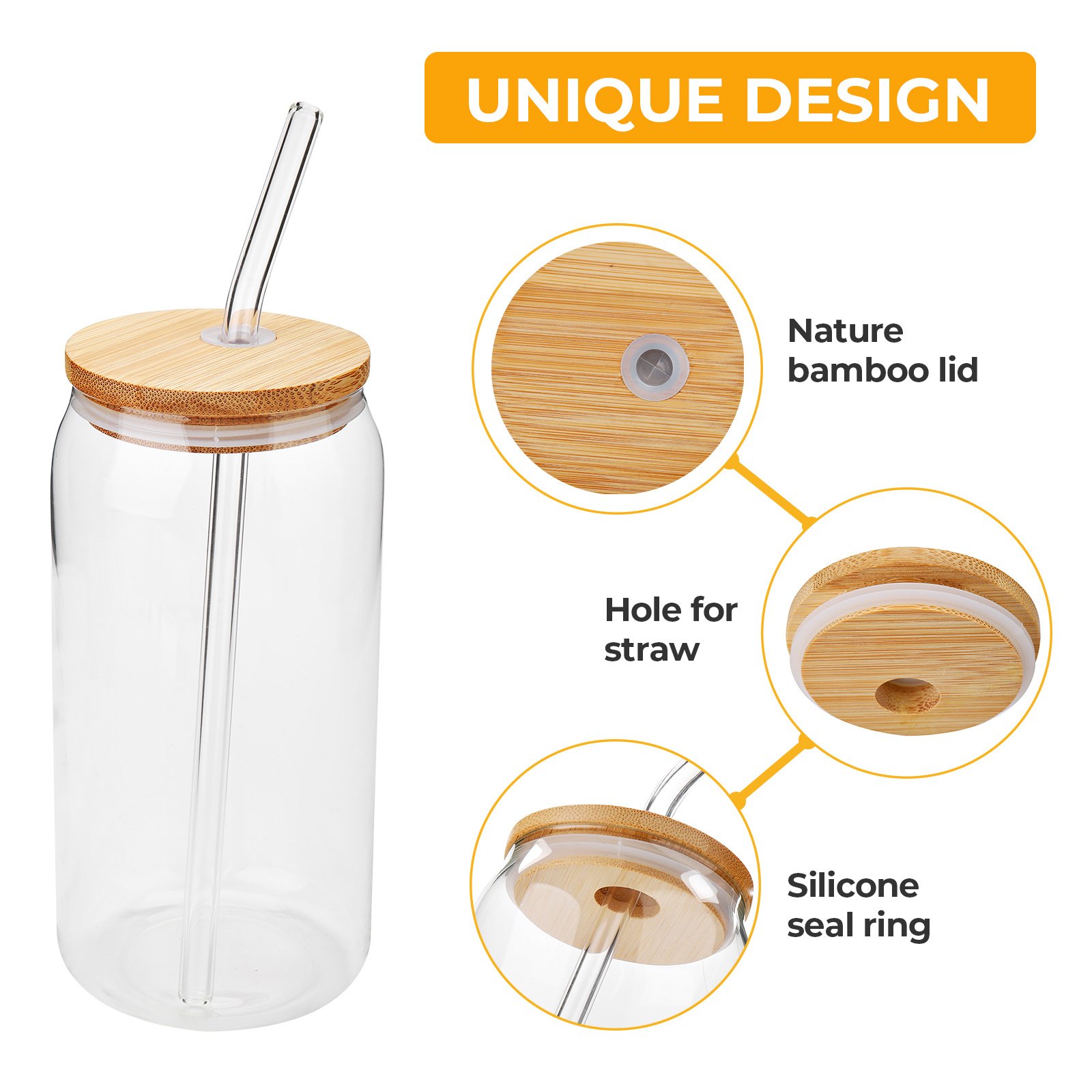 ✅Bamboo Lids with Silicone Strip: Each drinking glass cup is accompanied by a bamboo lid. A circular hole of silicone is incorporated at the top of the lid to accommodate a straw. At the base of the lid, a ring of silicone strips serves as a sealant, effectively preventing leaks caused by tilting cups. (Please note to dry the lid after cleaning to last longer)