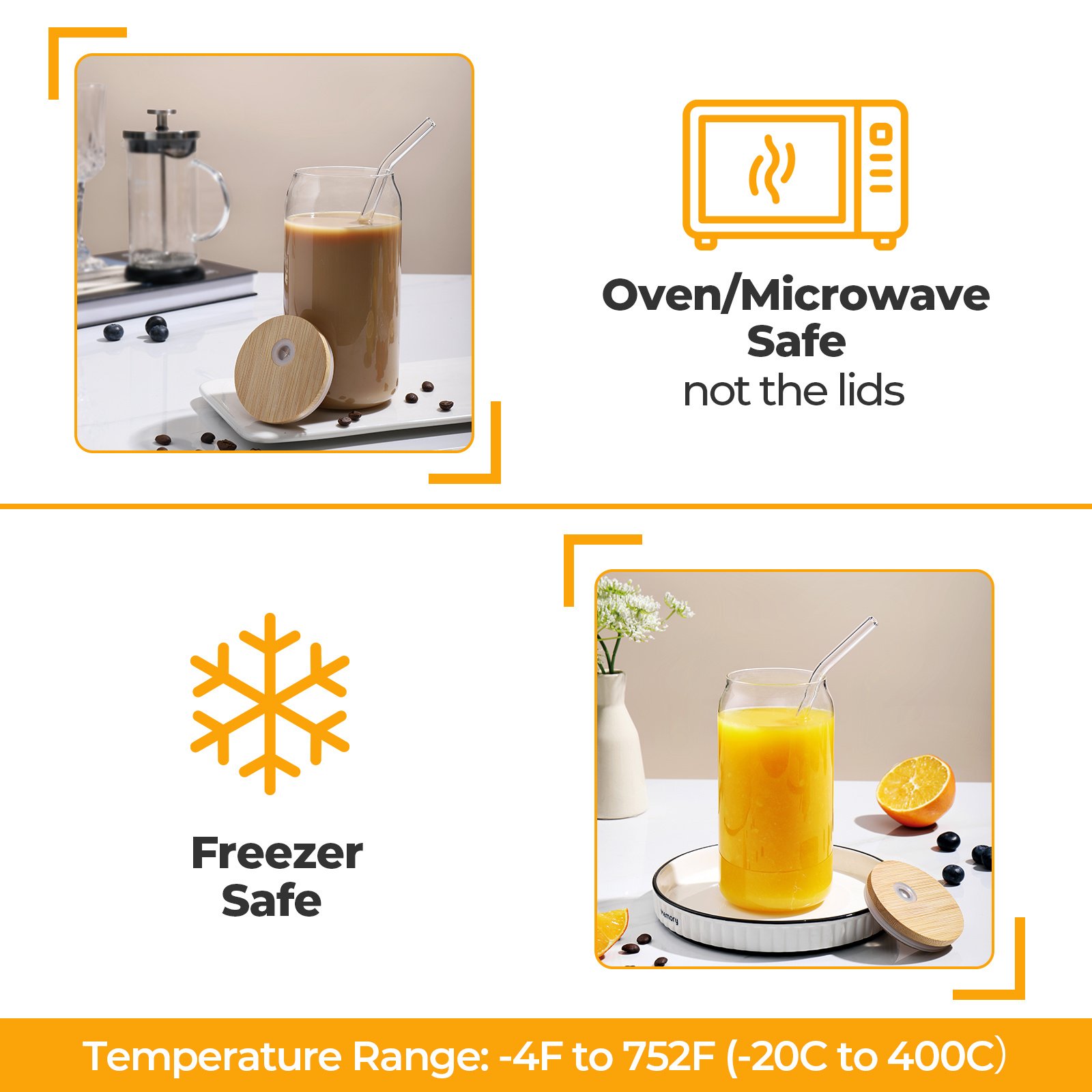 ✅Durable & Safe: Our iced coffee cups are crafted from premium grade borosilicate glass, renowned for its superior durability and safety. They can withstand temperatures from -4℉ to 752℉, you can use them in oven/microwave(Not the lids) and freezer.