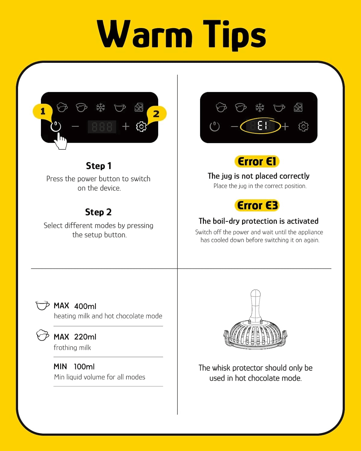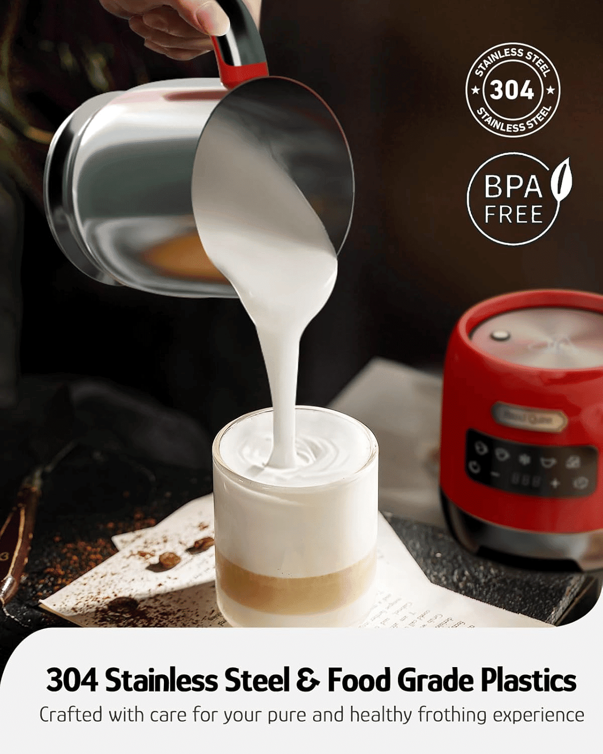 4. Adjustable temperature and thickness, LED touch control, cold and hot foaming, 5 in 1 function, dishwasher safety.