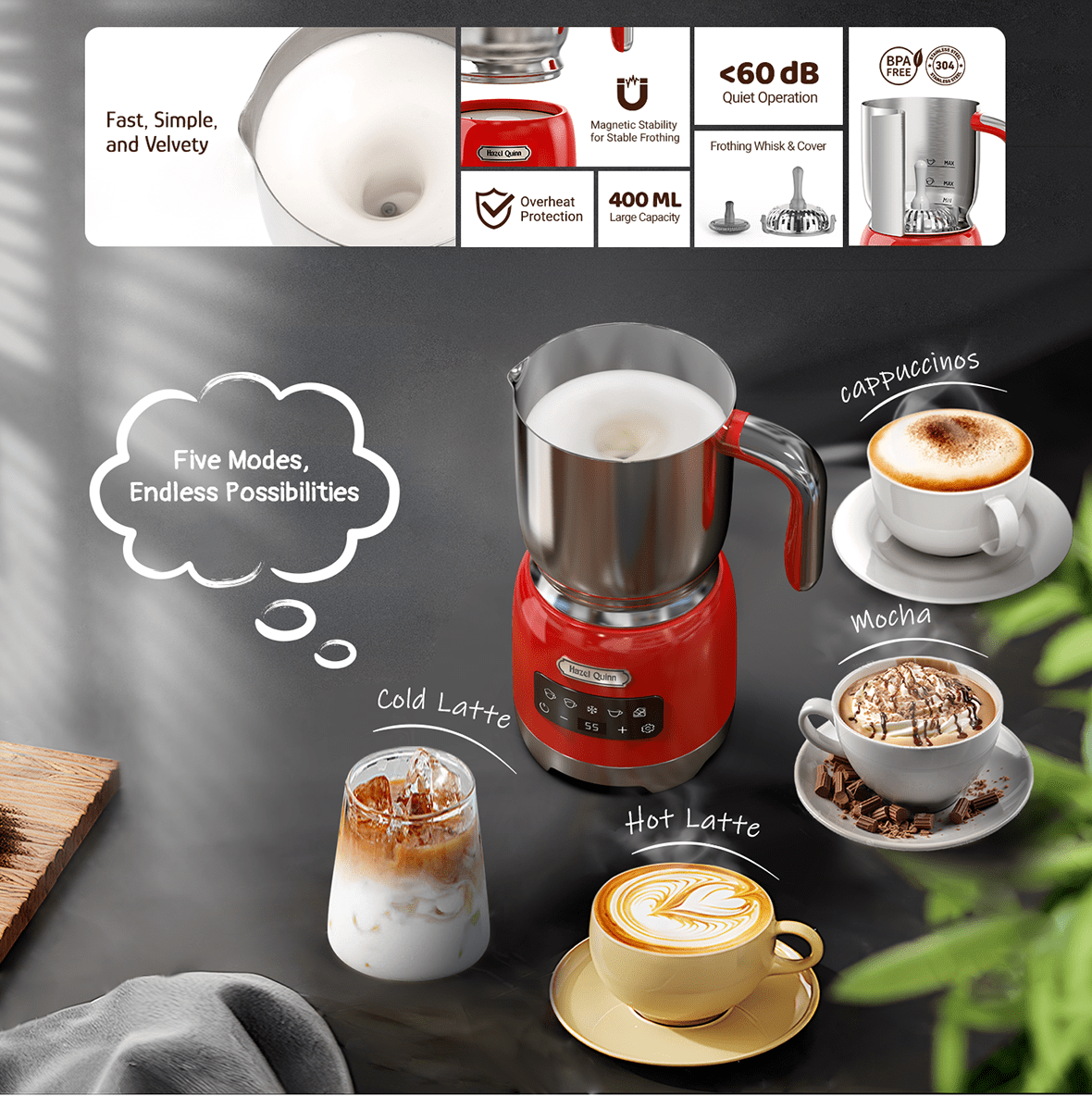 SKU: XQP001R 5in1 Ruby electric milk foam 5 settings Cold foam hot foam hot air foam Hot milk or hot chocolate LED touch control 400ML/13.5oz cold and hot latte, cappuccino 360°, rotating base SUS304 food grade without BPA automatic closed