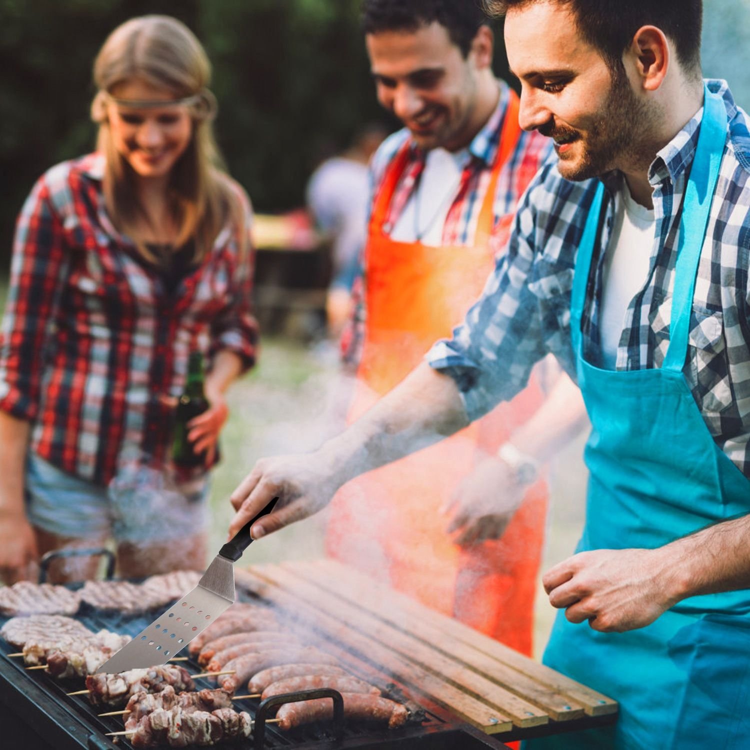 *7Pcs BBQ Griddle Kit*:Come with 7Pcs grilling set including 1 large solid spatula; 1 large slotted spatula; 1 regular-sized solid spatula; 1 solid griddle scraper; 1 chopper and 2 sauce bottles; satisfying all your barbecue and camping needs.