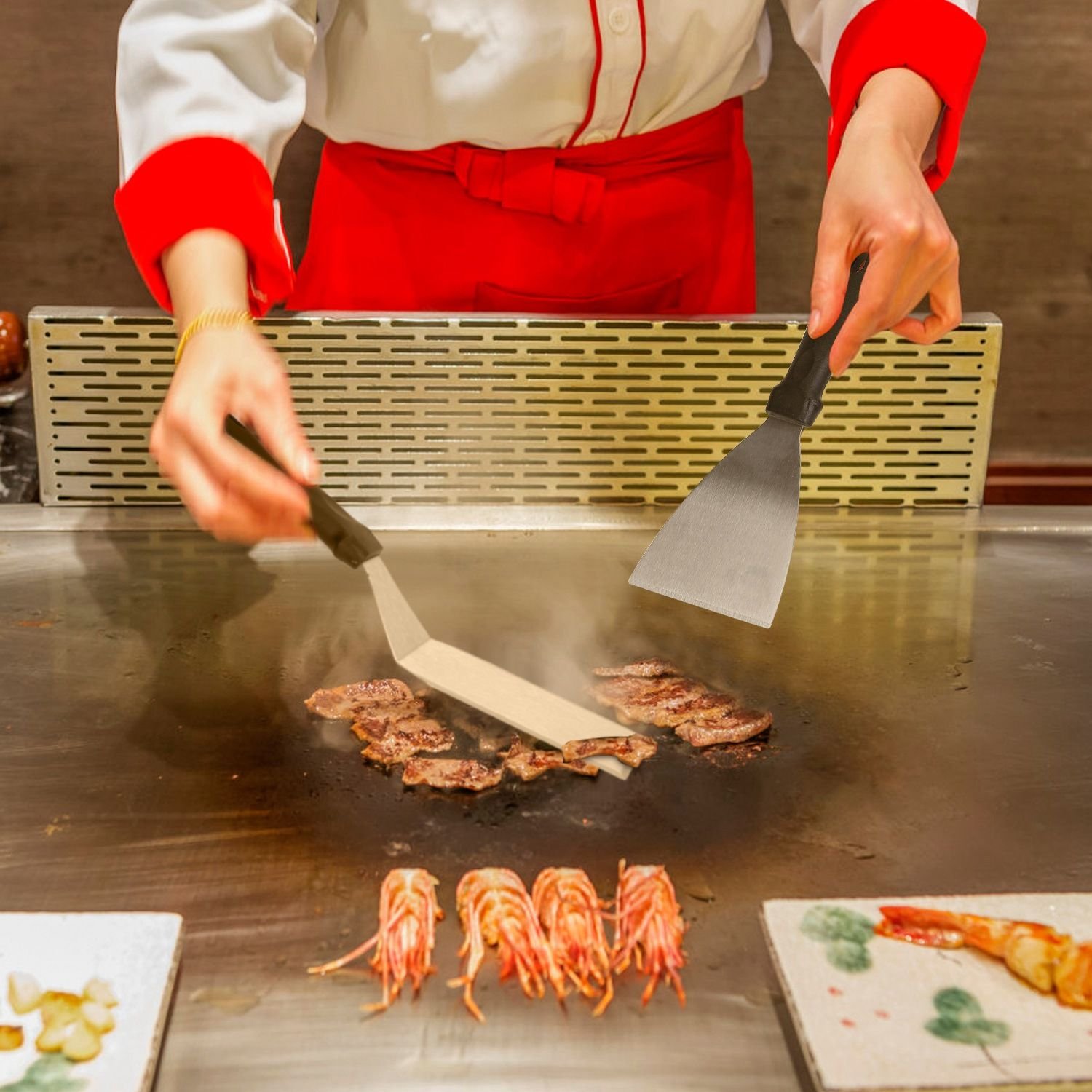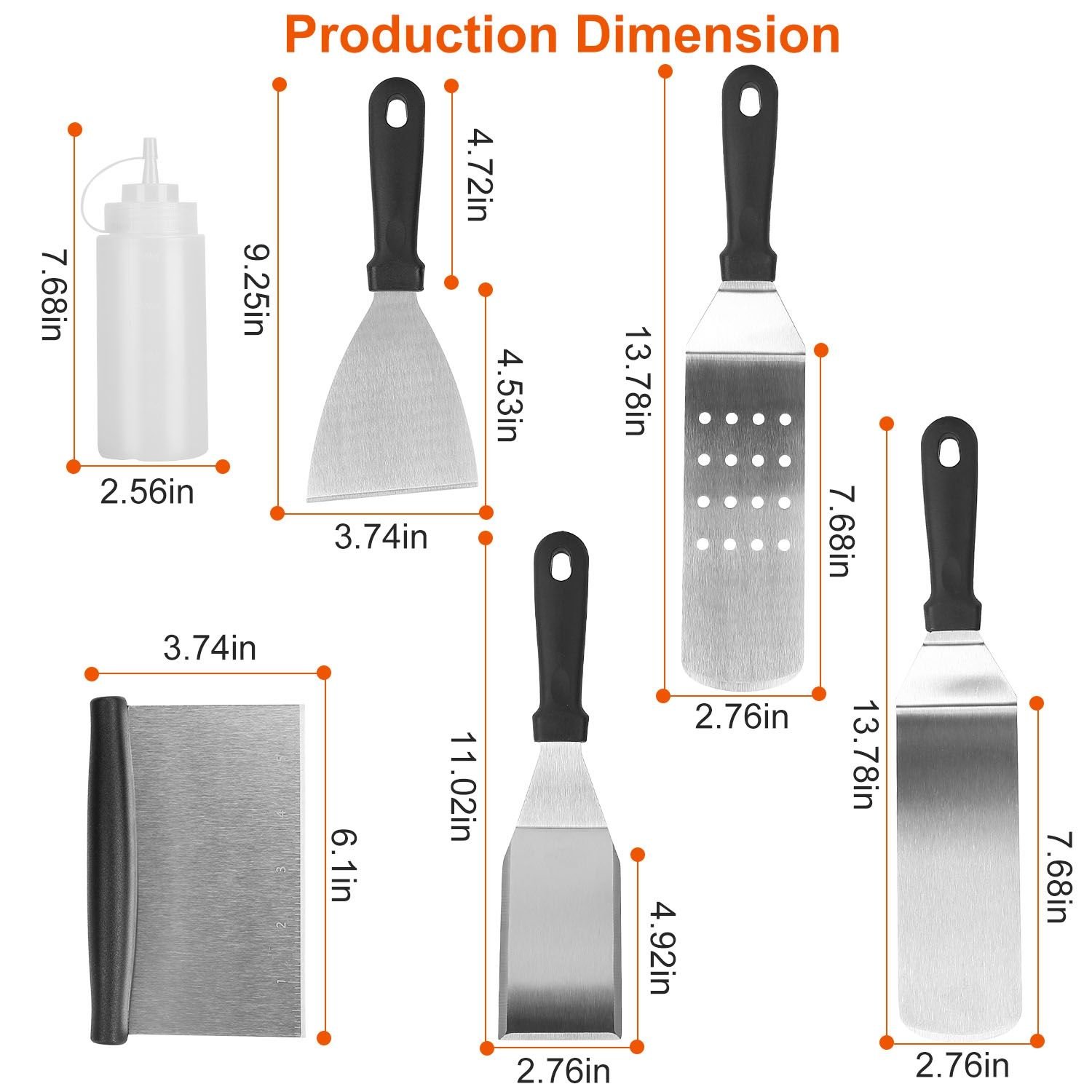 *Multi-Purpose Utensils Kit*:Made of rustproof stainless steel coupling with impact-resistant PP handles; the kit can turn; chop; scrape and more; satisfying your daily appetites. Large griddle spatulas for flipping beef cubes; fried egg; rice; noodle and vegetables. Regular-sized spatulas with 3-side sharp edges for turning burger; pancake and cutting bread; meat and sausage or cutting while cooking. Chopper to dice food and scrape griddles clean. Squeeze bottles for liquids oil.