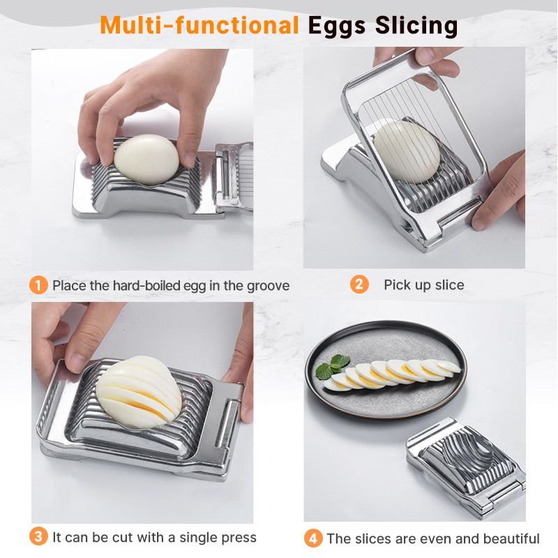 3.Ergonomic Design: Egg Slicer made of high quality high quality aluminum alloy for the base and handle, Ergonomic design makes it easier to use. You just need to lower the food in the card slot and then press it gently to get neat slices.