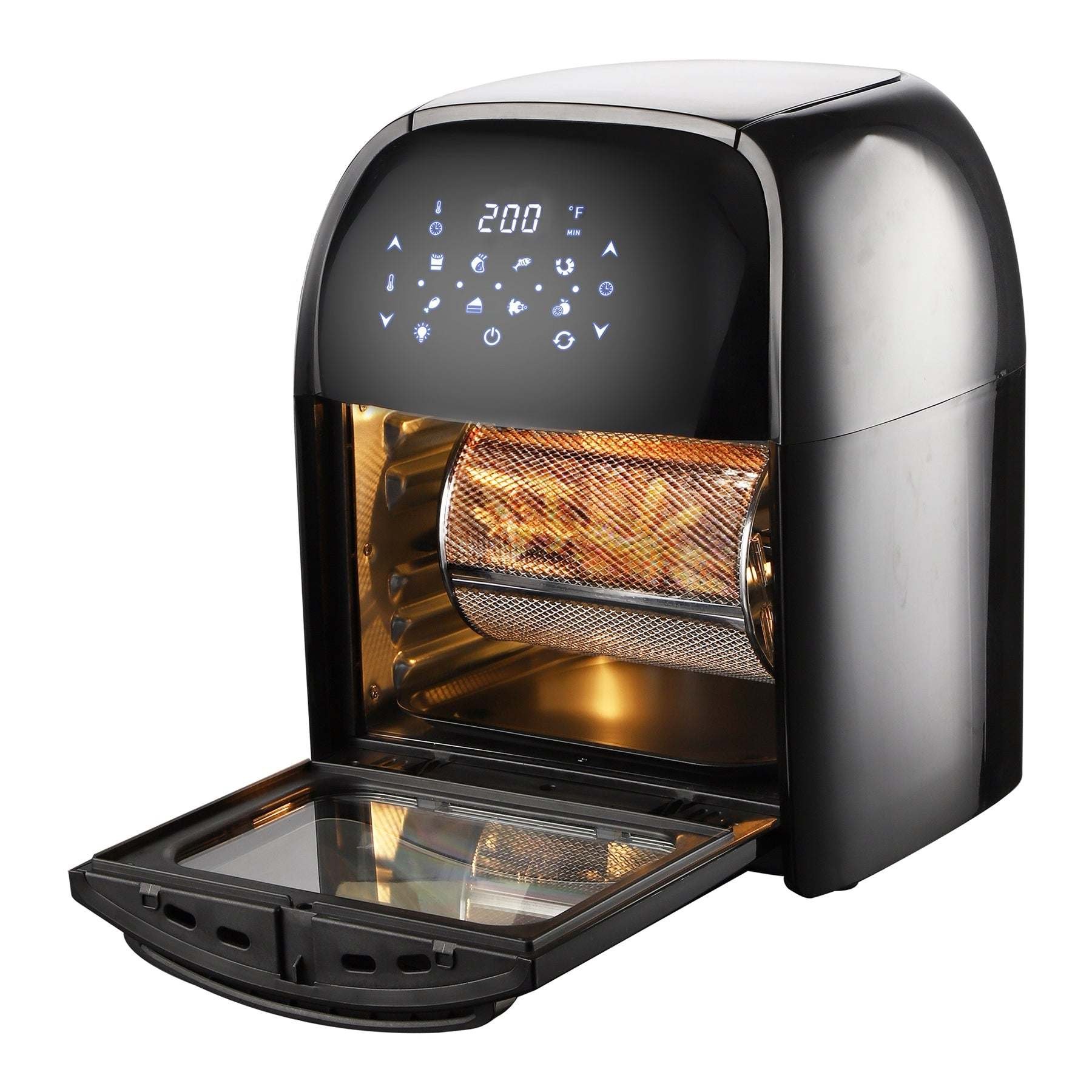 - Accessories: Rotating Mesh Basket, Drip Tray, Rotisserie Fetch Tool, Air Flow Tool, Air Flow Rack, Rotisserie Shaft, 1 Set Of Forks And Screws, Manual