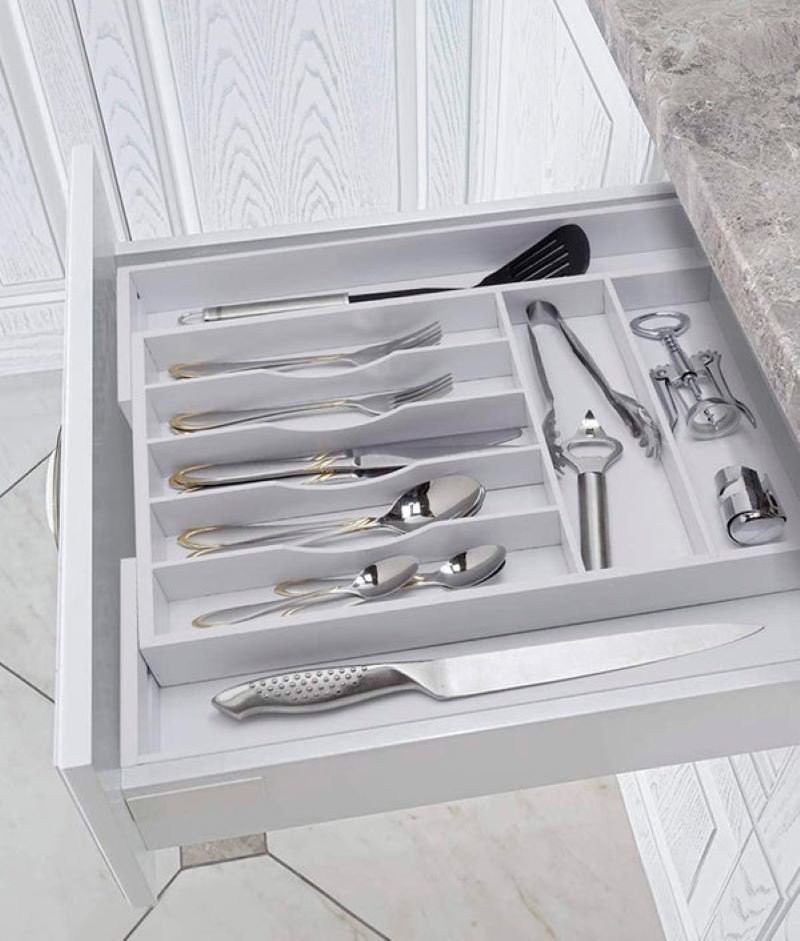 5.The various compartments provide optimal space for holding teaspoons, soup spoons, forks, knives, and various serving pieces, as well as cooking utensils and tools like tongs, can openers, and food thermometers.