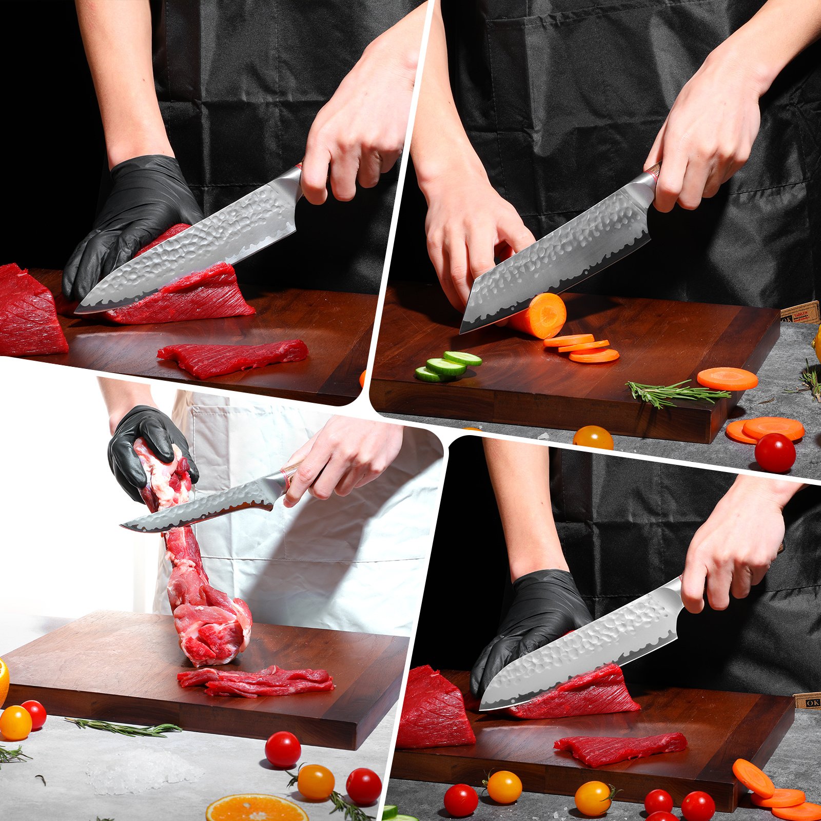• Features : Japanese Kiritsuke chef knives are hand forged using the traditional one piece molding process to prevent the handle from falling off, are durable and easy to cut. It makes our kitchen knives more refined, sharper and last longer