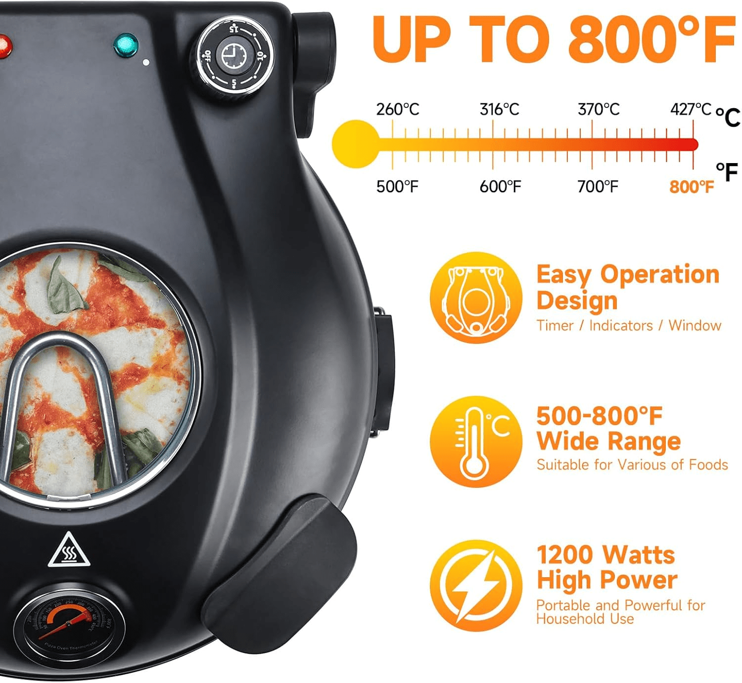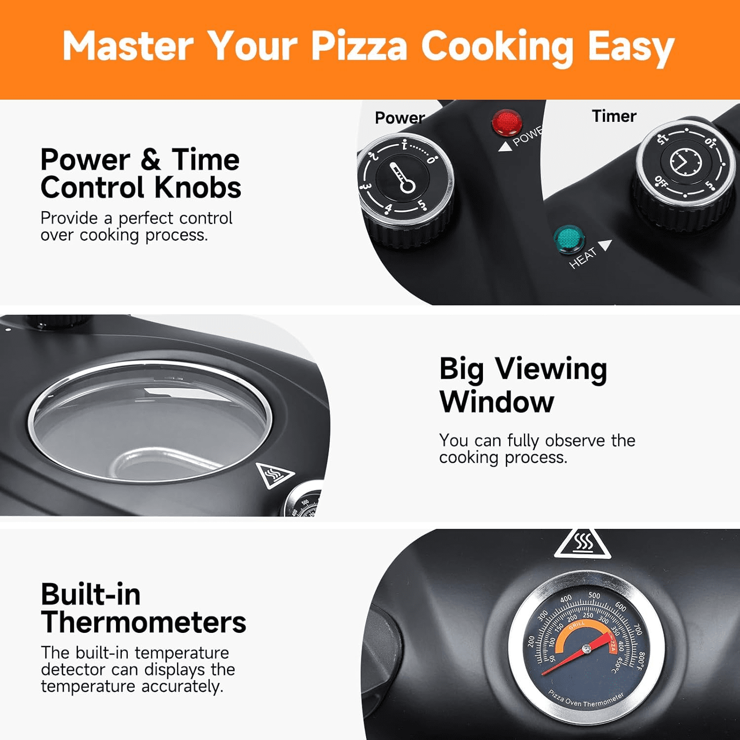 Product functions: indicator light, timer, steam function, adjustable thermostat, portable, built-in thermometer, pizza making