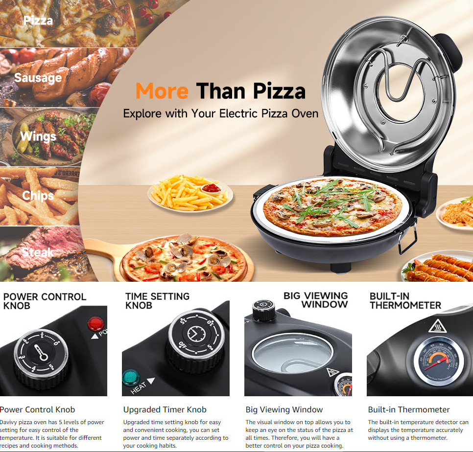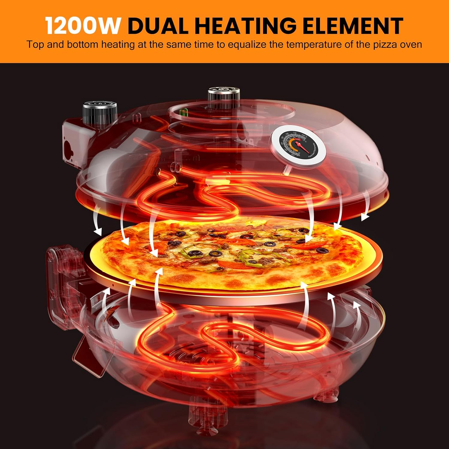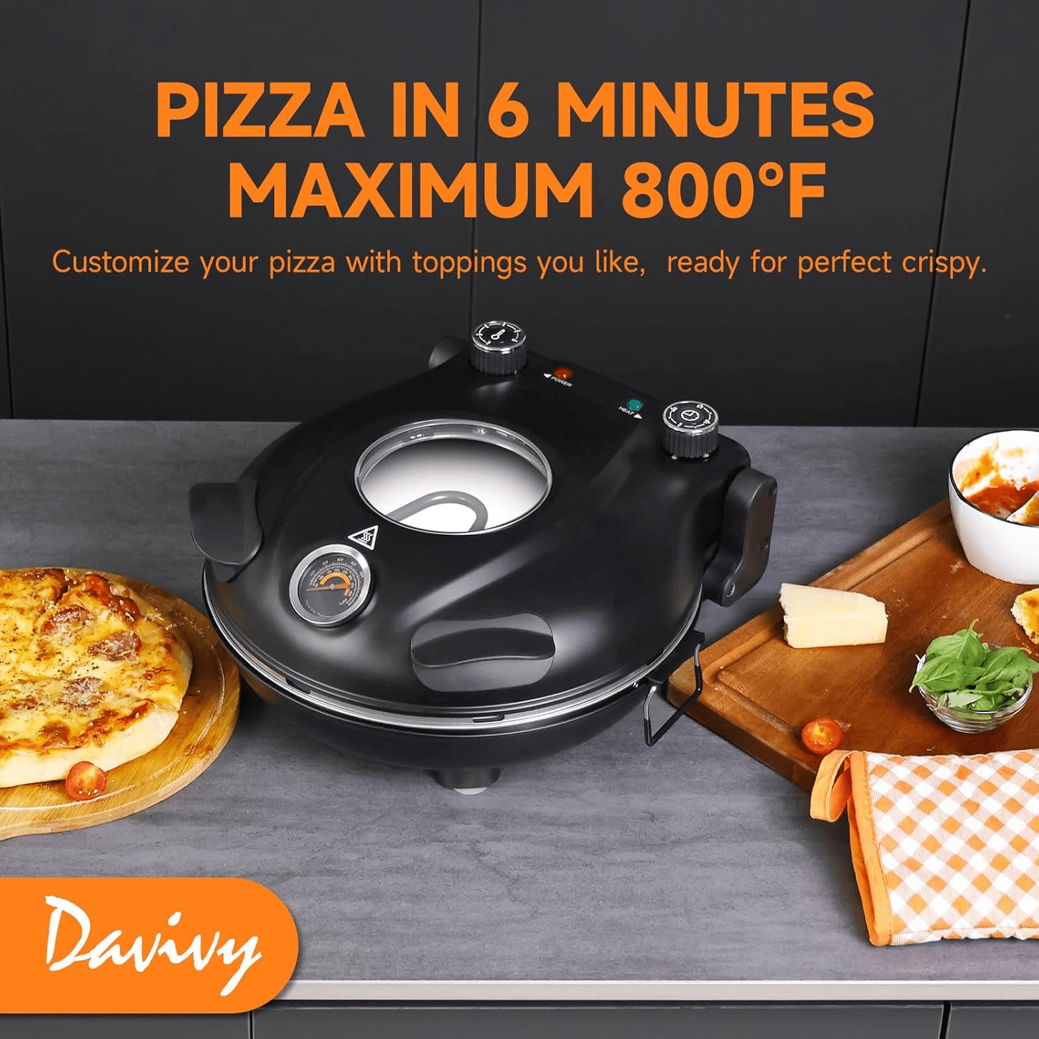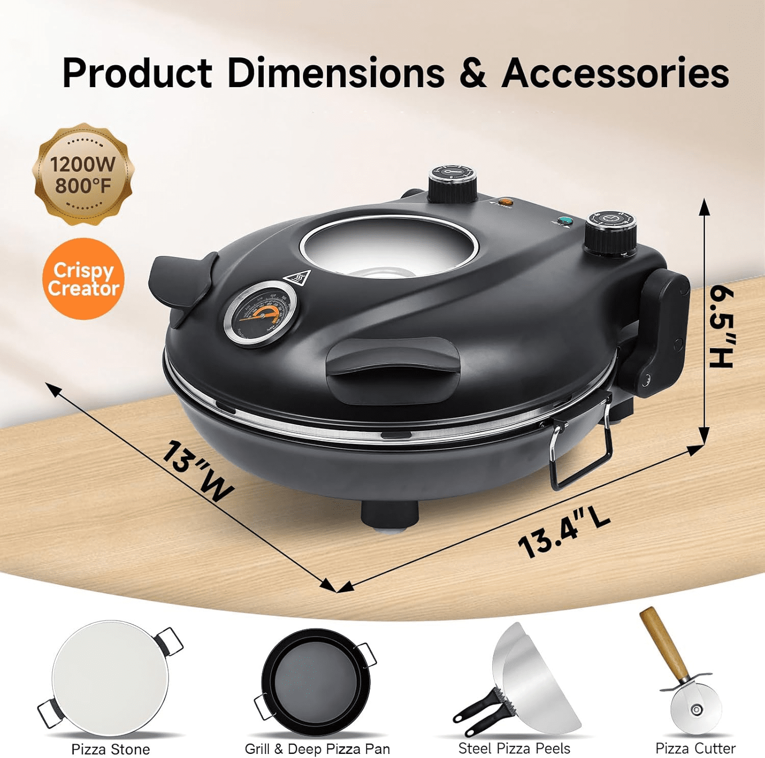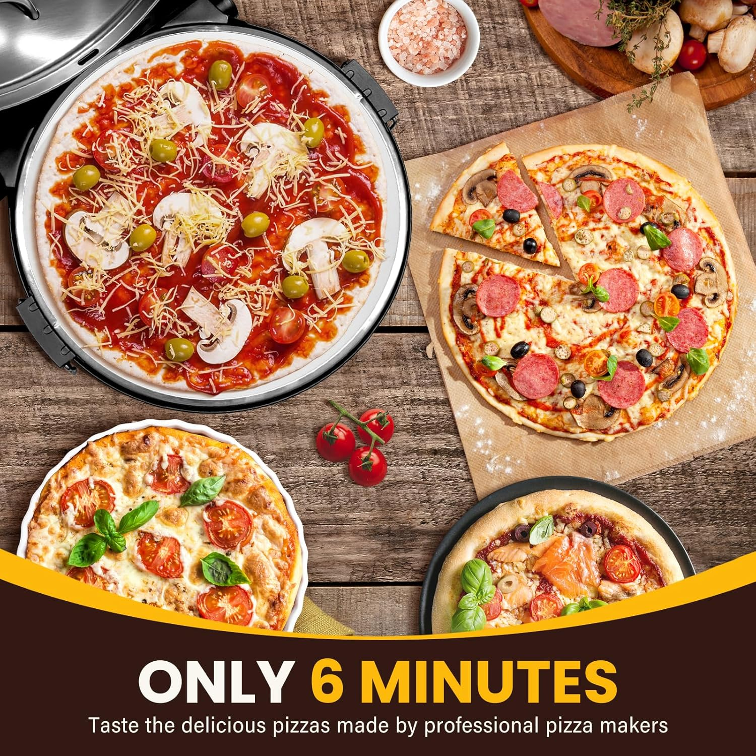 [Pizza Quality at Home] With our electric pizza oven, you can experience pizza quality in just 6 minutes! Unlike traditional ovens that only reach 450-500°F, our ovens are heated to 800°F to ensure a crispy crust every time. Its advanced design allows you to adjust the baking time according to the thickness of your pizza. Enjoy the convenience of a professional-grade oven in the kitchen, and savor delicious, crispy pizza when you need it. Improve your pizza making game with precision and speed.