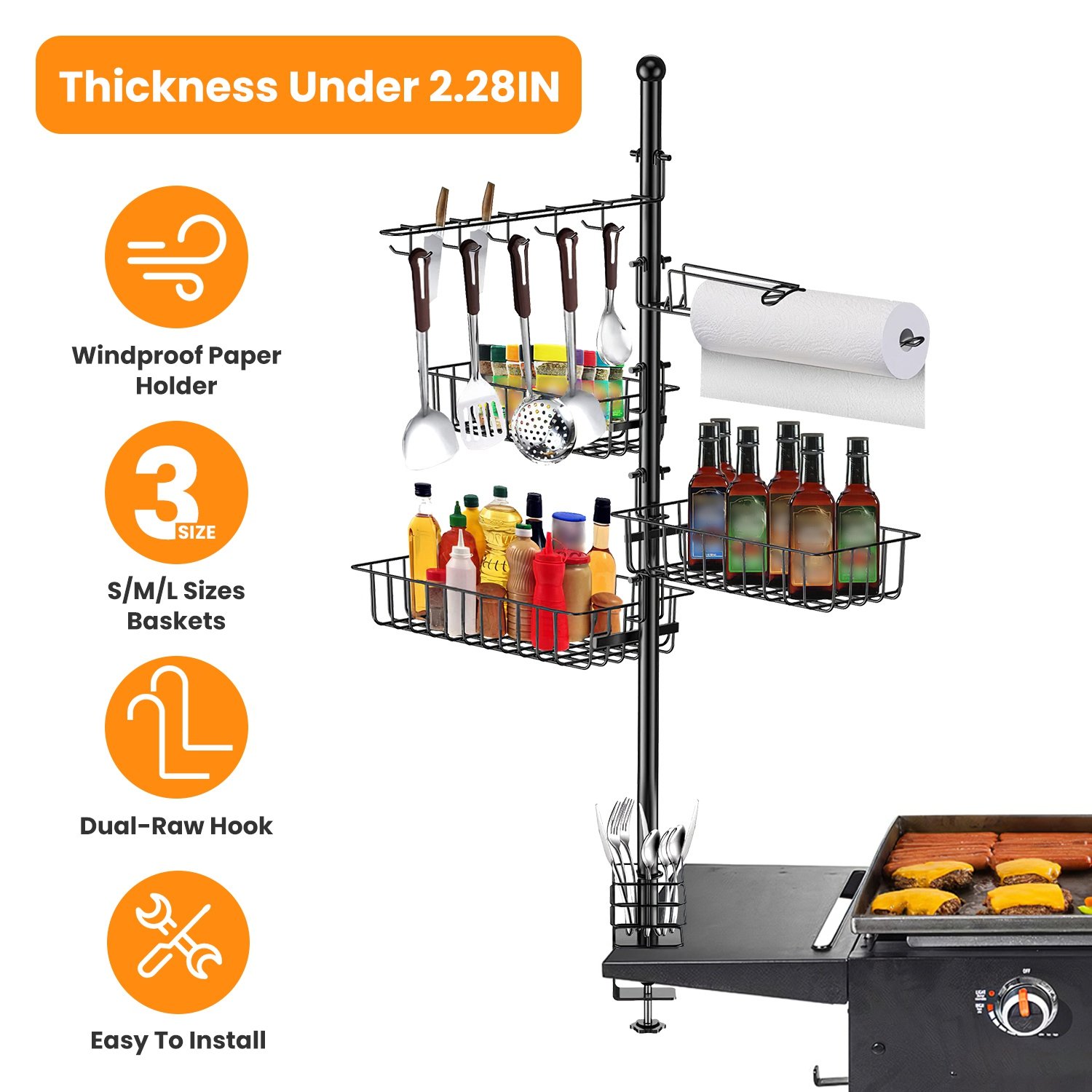 Come with S/M/L baskets for various bottles and cans, dual-row hook with 10 hanging placements for cooking utensils and paper towel holder with weighted arm, our upgraded standing BBQ caddy rack maximizes vertical storage space while saving countertop operating space, providing easy access to everything you need. Made of thickened carbon steel with rustproof powder-coating, our griddle caddy is built to last and can withstand harsh weather conditions. Equipped with a C-shape clamp base, this griddle caddy securely attaches to any Blackstone griddle cooking stations or outdoor tables with thickness under 2.28inches.