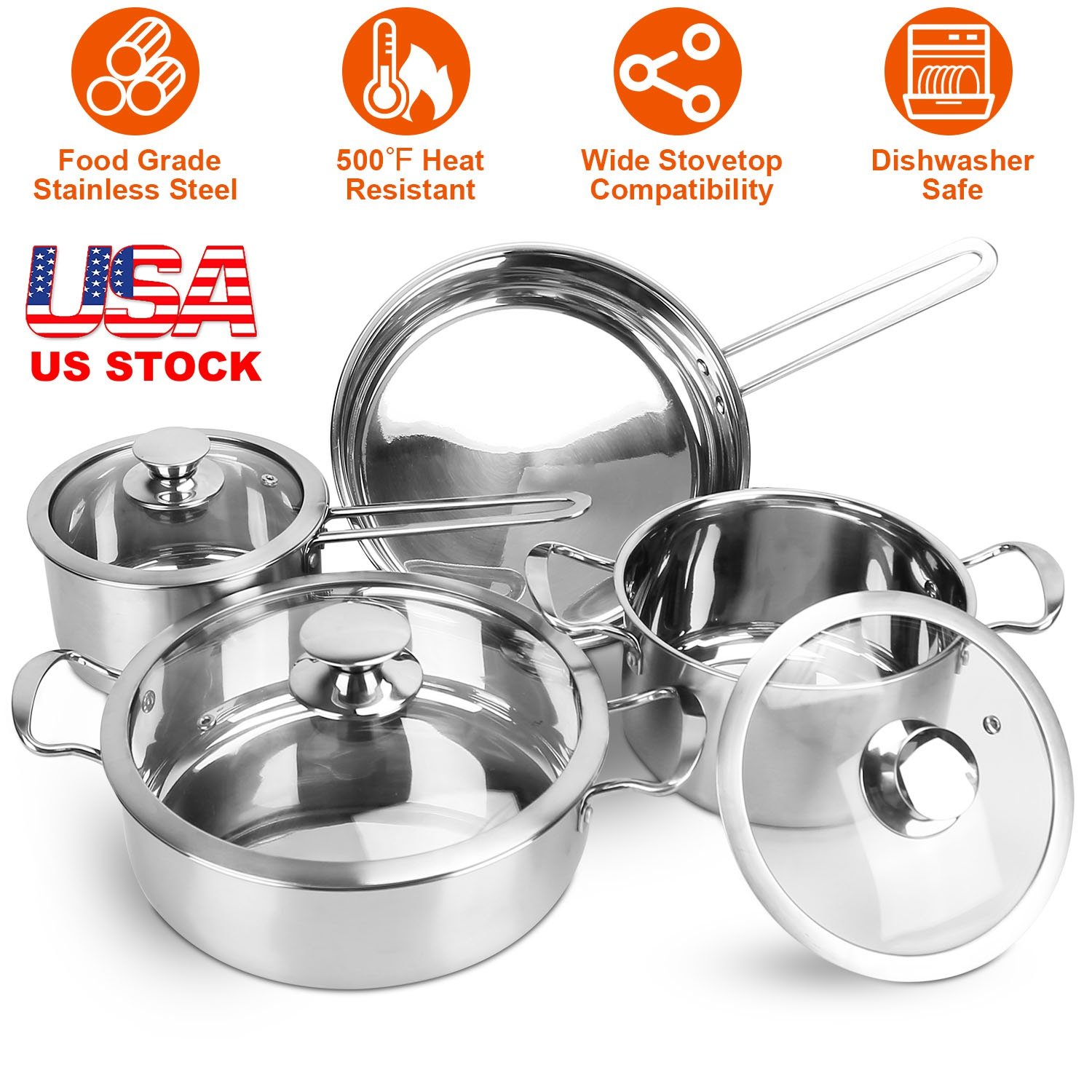 Need a cookware set to upgrade your kitchen and cook a delicious meal for cozy dinner party? This cookware set provides exactly what you want. Saucepan and stock pot, all with tempered glass lid, are multifunctional to meet your daily cooking demands. 9.17in Frying pan enables you to cook delicious food. Tempered glass lid combines good seal and see-through observation, sure to help a lot during cooking time. It is also designed with a stem outlet on lid, so as to effectively discharge the heat and relive the pressure inside, for higher using safety. What matters most is the food grade stainless steel, which is safe enough for use, durable enough for longer life span. And solid connection can be seen in its strong rivet. All pots are compatible with different kinds of stovetop, and even oven and dishwasher safe, leaving you no worry at all. Besides, the pots are equipped with convenient handles, which features comfortable grip feeling. Bring the cookware set home and enjoy cooking.
