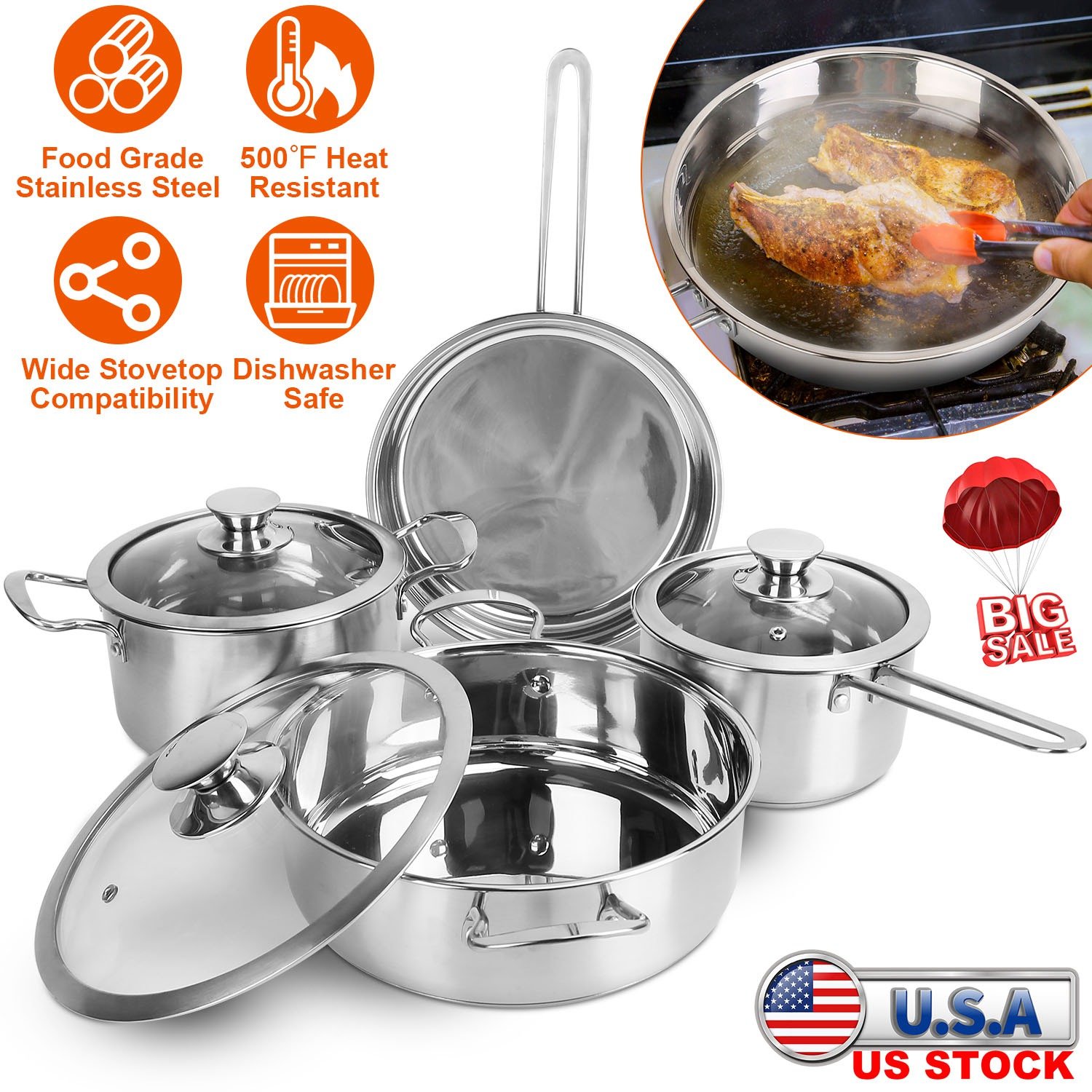 Home > Stainless Steel Cookware Set Fast Even Heat Induction Pots Pans Set Dishwasher Safe with 2.7/3.7 Quart Stockpot 2 Quart Saucepan 9.17in Frying Pan