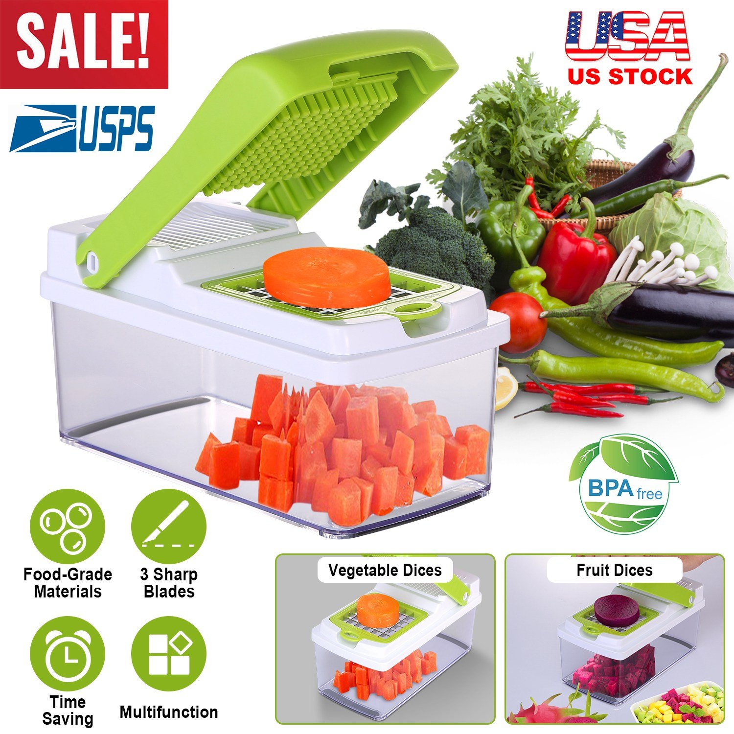 Our vegetable slicer is designed to be an amazing kitchen helper. Work excellently to cut not only vegetable but also fruit to make delicious dishes or fruit salad. Come with 3 interchangeable dicer blades, which make it much easier to get different size food dices in even shape as you need. Catch tray with rubberized non-skid base is useful to hold vegetable dices and no mess on your kitchen counter. Moreover, all parts of the vegetable slicers are made of food grade materials (quality ABS plastic + stainless steel), which is BPA-free and safe to use; also they can be easily detached for easy cleaning and storage. Save your time and energy while cooking but add no additional cleaning/storage task to you.