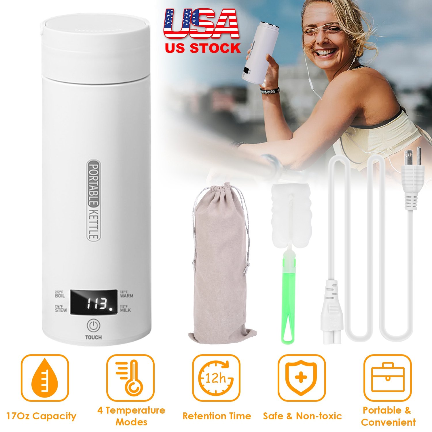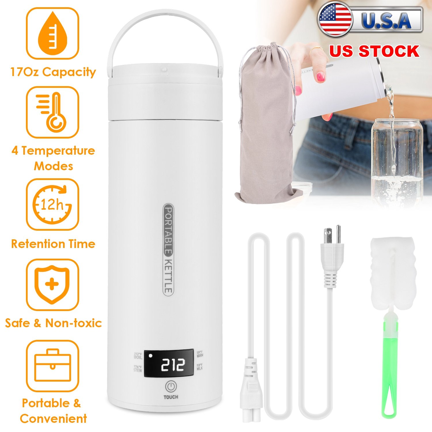 Looking for a portable electric kettle that allows you to take it anywhere? Featured with 4 preset modes(113℉/131℉/176℉/212℉), our electric kettle allows you to enjoy any hot or warm beverages, fully satisfying your drinking preferences. One button control, easy to operate. The LCD display also enables you to know the exact heating temperature. Keep drinks stay at the desired temperature for 12 hours in the plug-in state and 2 hours in the unplugged state. Made of with PP and 316 stainless steel, safe, non-toxic and leak-proof. The 500ml/17Oz capacity and the inbuilt handle make the kettle the right size for you to carry and drink from throughout the day. A perfect companion for home, office and travel.