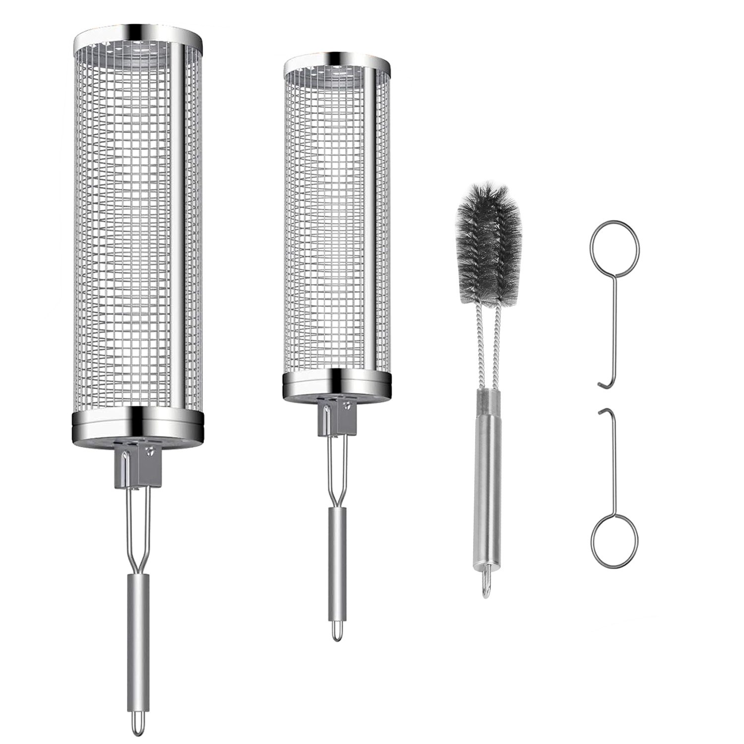 Looking for portable grilling accessories for outdoor grill? Try these BBQ net tubes! Made of rust-resistant 304 stainless steel, our rolling grill baskets can not only can withstand the heat of the grill, but also rotate 360 degrees to ensure that food is evenly heated. Features firm lids to secure food, portable handles to rolling the basket and convenient hooks to securely lock or unlock the baskets. Dishwasher safe and easy to clean with the included cleaning brush. Perfect charcoal grill accessories to cook food, such as asparagus, string beans, spinach, kale, brussel sprouts, french fries, meatballs, salmon and even fruits. Comes with 2 different size. Grill more food in less space at the same time!