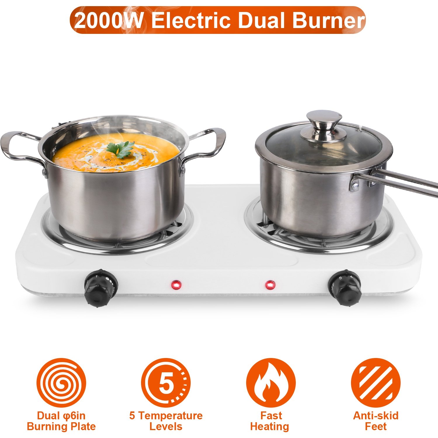 Home > 2000W Electric Double Burner Portable Coil Heating Hot Plate Stove Countertop RV Hotplate with Non Slip Rubber Feet 5 Temperature Adjustments