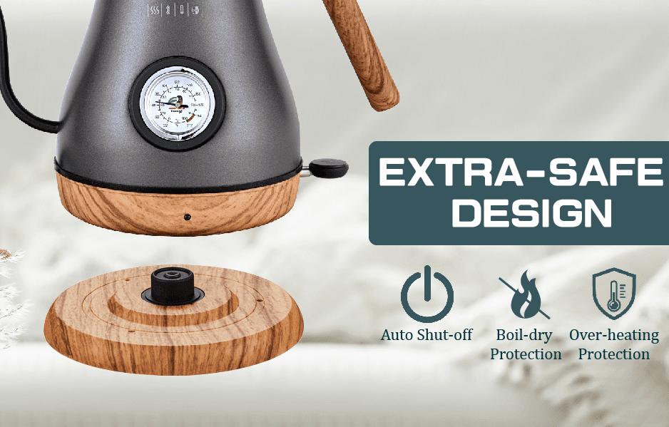 Temperature Display and Safety Features: A graded thermometer displays the ideal brewing temperature, and this unique feature can help you determine the exact temperature required for your coffee or tea.(Infant Mix-104-140°F; Green Tea and White Tea-175-185°F; Instant Coffee-194°F; Black Tea-212°F)