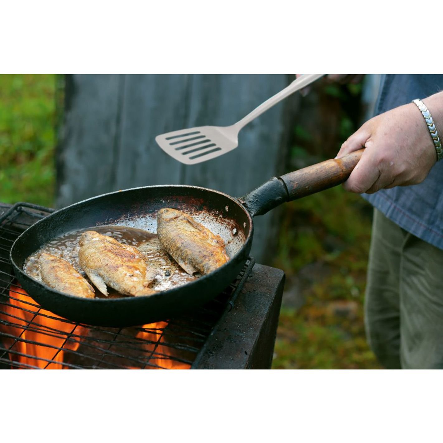 Constructed with a sturdy, stainless steel core and spatula head, this fish spatula is designed with optimum quality for heavy and long durable grilling. Great for use with whole fish, filet, seafood cakes, and more!